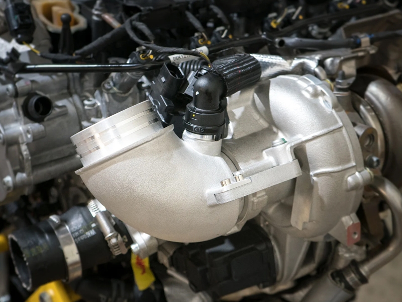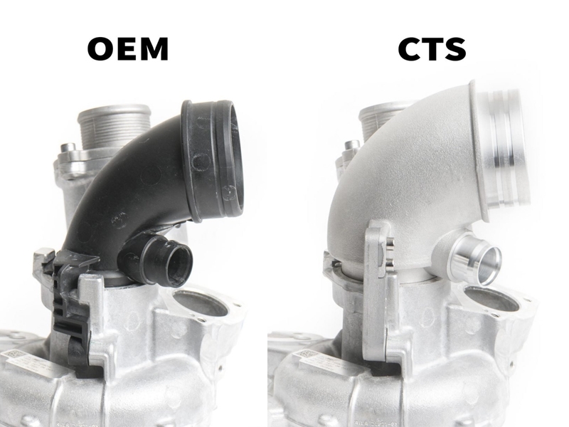 Este inlet de turbo desarrollado por CTS Turbo sustituye directamente el conducto plástico original que enlaza el turbo con la admisión en los motores 2.0 TSI EA888 Gen.3. Gracias a su construcción en aluminio forjado y a su diámetro ampliado, reduce drásticamente las restricciones del sistema, permitiendo un flujo de aire más eficiente y una mejor respuesta del turbo. Su diseño rígido y optimizado garantiza un rendimiento estable tanto en vehículos de serie como en configuraciones con admisiones de alto caudal.