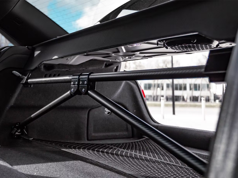 Esta barra de refuerzo trasera en configuración X de Racingline ha sido desarrollada para los Audi A3 8V, S3 8V y RS3 8V / 8Y. Fabricada con tubos de fibra de carbono, combina una gran rigidez estructural con una reducción significativa de peso, aportando además un acabado visual de alto nivel en el interior del maletero.