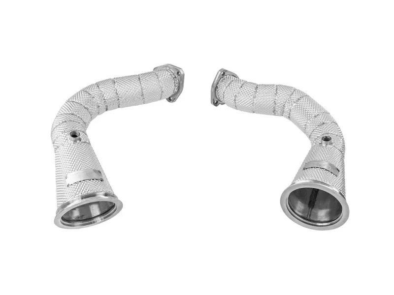 Estas downpipes descatalizadas Alpha Competition están fabricadas en acero inoxidable T304 de alta calidad y soldadas mediante TIG de precisión. Con un diámetro de 5" (115 mm) que se reduce a 3" (76 mm) para permitir la conexión con el escape original, se instalan sin modificaciones entre los turbos y los tubos delanteros de los motores 4.0 TFSI de los Lamborghini Urus y Audi RSQ8. Con un diseño de alto flujo y aislamiento térmico específico, ofrecen una ganancia media de 55cv en un motor con stage 1, además de un sonido más agresivo. Este conjunto combina la máxima calidad de fabricación con una excelente relación calidad-precio.